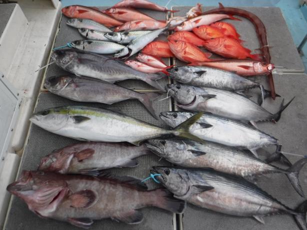幸丸では、キハダマグロ・カツオ・カンパチ・マハタ・ケンサキイカ、その他青物、根魚を季節に合わせて、